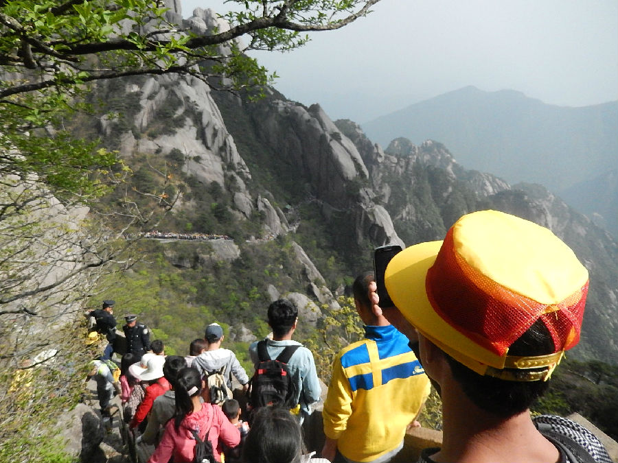 看過上圖,不知幾個(gè)人還能睡得好,雖然白天爬山太累??本人也本著之前去過一次黃山,認(rèn)為黃山的風(fēng)景還是很秀麗的,所以在今年5.1又帶家人去了一次,由于過節(jié)太擠了,索道太難等了,全家都是從云谷索道爬上去的,因?yàn)槲胰ミ^一次,所以就由我?guī)ьI(lǐng)家人從以前走過的線路走的.本以為這次也帶家人看一看黃山在書中所寫的半山寺外抬頭見,展翅金雞叫道衢;登上龍?bào)椿厥锥茫黾缥謇仙咸於?/span>的風(fēng)景,可惜月份去得太早了點(diǎn),樹也才發(fā)芽,葉子都還沒有長(zhǎng)出來,最難受的那就是人太多,一路是走走停停,不遠(yuǎn)的路都要走比平時(shí)多幾倍的時(shí)間.